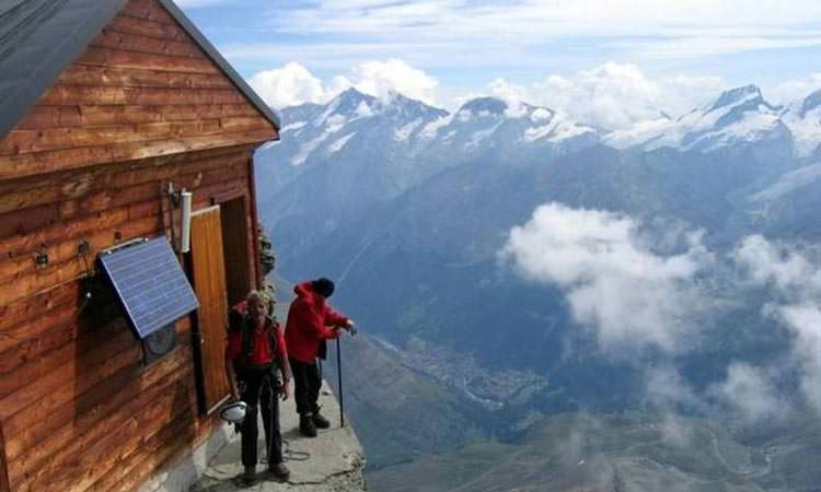این کلبه در ارتفاعات ۴ هزار متری سطح دریا در سویس واقع شده است. همانطور که میبینید، لبهی باریکی جلوی در ورودی آن قرار دارد.